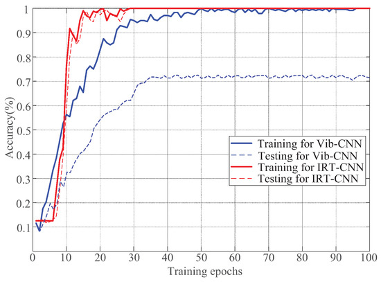 Figure 14 shows the overall accuracy curves of the training and testing for proposed IRT–CNN and Vib-CNN methods over 100 epochs. As seen in Figure 14, it can be clearly observed that both the training accuracy and testing accuracy of proposed IRT–CNN method converge to a stable value after 30 epochs, which is faster than that of Vib-CNN method after 50 epochs. This phenomenon demonstrates that the proposed IRT–CNN method has a better convergence performance compared with Vib-CNN method.
