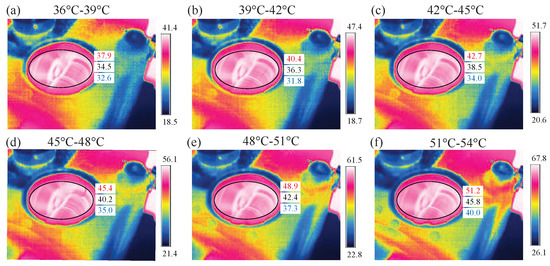 IRT images under normal condition of gearbox in six temperature ranges: (a) 36 °C–39 °C (b) 39 °C–42 °C (c) 42 °C–45 °C (d) 45 °C–48 °C (e) 48 °C–51 °C (f) 51 °C–54 °C.