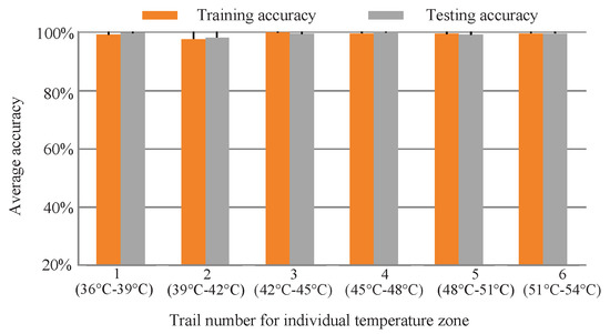 Furthermore, images with a wider temperature range of 36 °C–54 °C are also investigated to evaluate the performance of proposed IRT–CNN. In total there are 4800 samples (800 samples × 6 different temperature ranges) aggregated, 35% samples (1680 samples) of which are taken for training and the rest 65% samples (3120 samples) for testing. The classification results are listed in Table 5. As seen from Table 5, the identification of proposed IRT–CNN method reduces to 95.53% with a standard deviation of 0.912. The classification results show that proposed IRT–CNN method still produces a satisfactory output even when operating in a much wider range of temperature fluctuations. This means that the proposed method is robust to ambient changes and verified to be accurate and reliable for different applications.