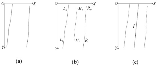 At first, the captured finger image is filtered to remove noise, and the edge line of the finger is detected. Then, the point coordinates of two edge lines are extracted to calculate the midpoint coordinates. As shown in Figure 3b, {Ln} (n = 1,2, …, N) represents the coordinate set in the left edge line of the finger, and {Rn} represents the coordinate set in the right edge line of the finger, X and Y represent the row and column coordinates of the midpoint {Mn}. The calculation is as follows: