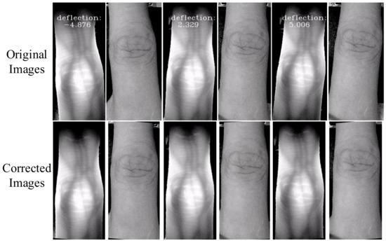 Noteworthy, the center of rotation should select the center of the finger direction line l, which can reduce the amplitude of the posture swing of the finger and improve the stability of the correction. Hence, taking the midpoint MN/2 as the center of rotation and θ as the angle of rotation, the finger in the finger-vein imaging space is rotated and corrected. Some original images and corrected images for the same finger are shown in Figure 4.
