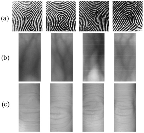 The finger trimodal region of interest (ROI) images of four fingers. (a) fingerprint (FP) ROIs samples; (b) samples of finger-vein (FV) ROIs; (c) finger-knuckle-print (FKP) ROIs samples.