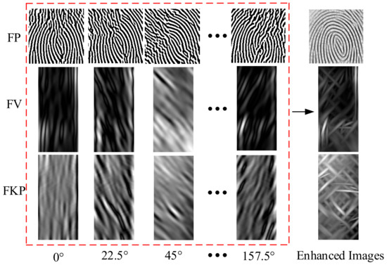 In recent decades, Gabor filters have been widely applied in many fields since they not only extract the texture information in multiple directions of an image, but also reduce the influence of illumination to some extent [32]. In terms of the abundant texture information of FP, FV, and FKP traits, with respect to direction, oriented Gabor filters are used here to perform image enhancement.