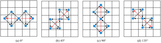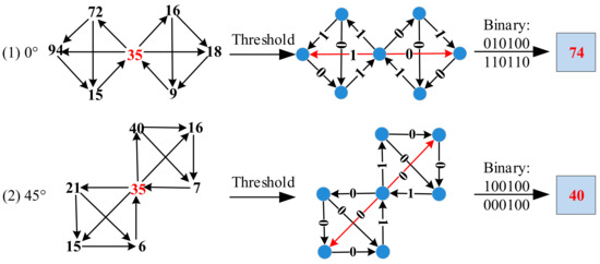 From Figure 9, we can see that the coded values of the target pixel at 0° and 45°, respectively, can be obtained according to Equations (6)–(8). Similarly, the same calculation process is done at 90° and 135°. Thus, we calculate the coded values of the central pixel in these four directions as follow: