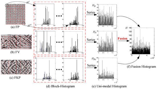 In this section, a gray histogram-based feature matching method is used for finger trimodal fusion recognition, as shown in Figure 10. First, the coded finger trimodal images are uniformly separated into M non-overlapping division blocks. Then, the M local histograms corresponding to each sub-block are established, respectively. Assuming that Hfvi(I = 1, 2, …, M) represents the histogram of the ith division block in a coded finger-vein image, the global histogram Hfv is defined as