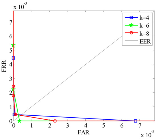 From Figure 11, we can see that the EER is lowest when k is 6. However, as the value of k increases, the time cost of finger feature extraction also increases. Considering recognition efficiency and accuracy, the parameter k corresponding to 6 is selected in following experiments.