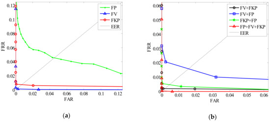 From Figure 14, we can see that the EER rate of different modal combinations are different. It is noted that the bimodal combination (FV + FKP and FV + FP) can achieve a better accuracy than single modal, especially for the FP trait and FKP trait.