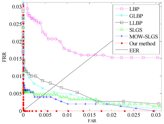 From Figure 15, we observe that the EER of the proposed approach is lowest among these feature extraction methods. Hence, feature expression based on the proposed coding approach can effectively address the problem of illumination and finger posture variation in finger trimodal fusion recognition.