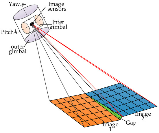 Traditional aerial optoelectronic platforms generally use two-axis [] motion, that is, yaw- and pitch-direction motion to compensate for the image sensor, but there are certain problems with this. The maximum disturbance of the optoelectronic platform on the carrier comes from perturbation in the roll direction. The yaw direction is affected by the airflow, and motion in the pitch direction changes relatively slowly. When the carrier is performing a large elevation movement or high-speed maneuvering, the overlap ratio of the image has a greater relationship with the angle of view of the image sensor. This is because image-sensor focal length is long and field of view is small. When certain interference is applied from the outside, it is difficult for two-axis compensation to uniformly respond to the carrier movement, and multiple obtained images have a slit when stitched, as shown in Figure 2. In particular, in the case of a long focal length and small field of view, the accuracy requirements of the system for each shafting are increased, and sensitivity to disturbance is enhanced.