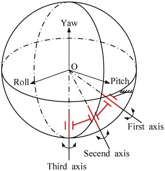 The direction of the third axis pointed vertically to the center of the sphere; the angle between the second and the third axis was 21°, and the angle between the first and the second axis was 23°. The transmission part of this platform is similar to the joint part of a robotic arm. Due to this, the D–H modeling method proposed by Denavit and Hartenberg [,] was used for kinematic modeling. This method is mainly used in robot kinematics. It establishes a coordinate system on each rod and realizes coordinate transformation on two links through homogeneous coordinate transformation. In a multilink series system, by using the homogeneous coordinate transformation multiple times, the relationship between the first and last coordinate system can be established.