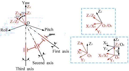 According to the D–H modeling method, the coordinate system of each rotation axis of the platform was established, where the Z-axis was the direction of each rotation axis, and the three axes intersected at a certain point in space; this point is the coordinate origin of each coordinate system. The X-axis direction was determined by the normal direction of the intersecting axis, and the Y-axis direction was determined according to the right-hand rule. Finally, the coordinate system of each rotation axis was established, as shown in Figure 4. The specific coordinate-system establishment process is not described again.