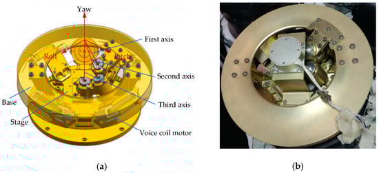 A traditional aerial optoelectronic platform is generally driven by a torque motor []. The drive motor is directly connected to the inner gimbal through the shaft assembly, and the image sensor is driven by the inner gimbal. The frictional disturbance of the motor and the shaft system is directly transmitted to the image sensor through the shaft system, which reduces image-acquisition accuracy. In addition, the gimbal shape is designed as a ring structure due to the driving form. However, a large ring structure has low fundamental frequency and a poor rigidity. When the motor is loaded with the torque to the ring structure for stability control, system bandwidth and other types of performance are severely limited.