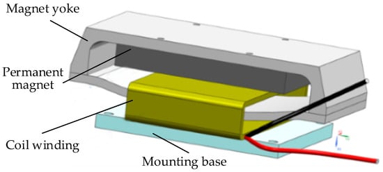 The structure and size of the voice coil motor were designed, which included permanent magnets, coils, and yokes, as shown in Figure 6. After the preliminary design, electromagnetic simulation software was used for verification, and the shape and related dimensions of the motor were modified according to the results. After repeated iterations, simulation results reached the requirements.
