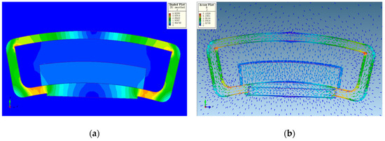 Electromagnetic simulation analysis results of voice coil motor: (a) magnetic induction distribution; (b) magnetic line distribution.