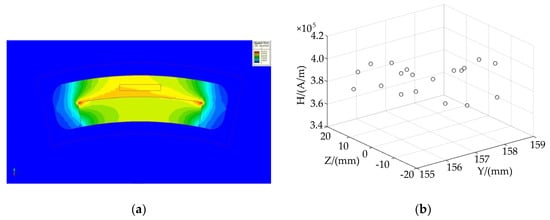 Analog value of magnetic field strength H: (a) magnetic field strength H test area; (b) magnetic field strength H distribution.