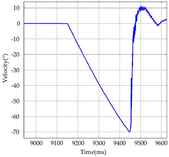 A traditional torque motor has poor speed-response characteristics, so it was necessary to measure the speed of the system. Taking the yaw axis as an example, speed input with an angular velocity of no less than 60°/s and an angular acceleration of no less than 200°/s2 was used for the step test, and the gyro feedback step characteristic curve was acquired; test results are shown in Figure 16. The measured angular velocity could reach 70°/s, and we also calculated the angular acceleration of the corresponding segment, which could reach 458°/s2.