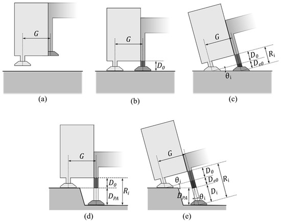 P–A component of displacement. (a) Device is lifted off the surface. (b) Device is laid on the hard level surface. (c) False reading caused by angulation of an unsteady hand when the probes are on the same level. (d) Contact points are not on the same level while exerting force. (e) False reading caused by the angulation of an unsteady hand when the probes are not on the same level.