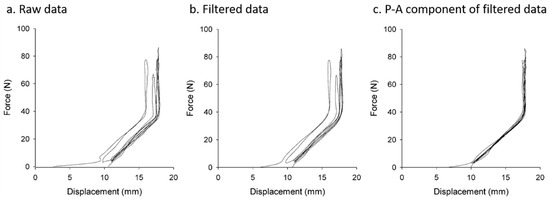 The data processing procedure and results are shown in Figure 6. The acquired data were first smoothed by a Savitzky-Golay filter with a second-order polynomial to the data frame of 41 data points. The purpose of using the Savitzky-Golay filter was to increase the signal-to-noise ratio without substantially distorting the signal [31]. Next, the P–A component of force and displacement were calculated based on the system parameters.