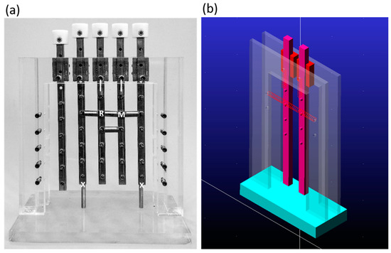 We designed a test rig that was connected with vertical and horizontal springs to simulate the spine structure, as shown in Figure 7a. This homemade testing rig of spinal simulation, which was composed of five sliders fixed on an acrylic frame, was used to verify the JAMTD in this study. The sliders could be set to limit the maximum downward displacement by inserting stop screws or posts underneath. Different numbers and types of springs could be attached between adjacent sliders and between a slider and the frame; thus, the stiffness could be changed.