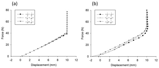 To verify the testing results from the testing rig, these simulation conditions were also modeled with Adams Student Edition (MSC Software Corporation, Newport Beach, CA, USA) to calculate the expected force-displacement behavior, as shown in Figure 7b. The simulation conditions were as follows: the applied force was quasistatic; the k value of each spring was 3.71 N/mm; without preload, the friction between each object was ignored; and the allowable displacement of the sliders was ten millimeters before hitting a hard surface.