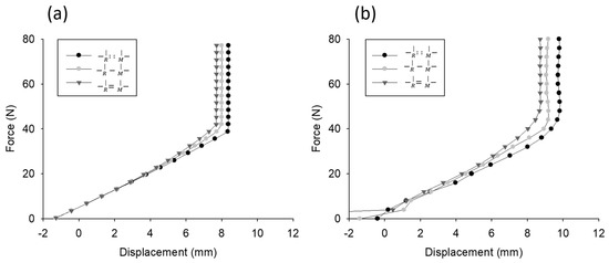 The force-displacement curves obtained by two probes simulated by the Adams model and those measured by the JAMTD are shown in Figure 9a, b, respectively. In particular, the displacement difference between the sliders in the three arrangements could be observed only with the two-probe measurement method. The test with an additional spring attached between the two sliders () had a shorter displacement than the test with the basic arrangement, and the test with no spring attached between the two sliders () had a longer displacement than the test with the basic arrangement.