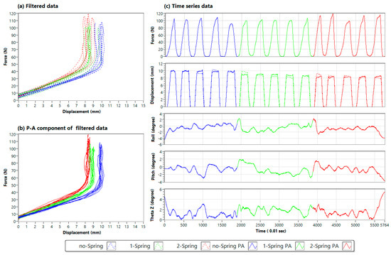 Detailed data measured in the two-probe test. (a) Filtered force-displacement curves. (b) P–A component of the force-displacement curves. (c) Time-series data (no Spring: filtered data from the test with no spring attached between the two sliders; 1 Spring: filtered data from the test with one spring attached between the two sliders; 2 Springs: filtered data from the test with two springs attached between the two sliders; no Spring PA: P–A component of the filtered data from the test with no spring attached between the two sliders; 1 Spring PA: P–A component of the filtered data from the test with one spring attached between the two sliders; 2 Springs PA: P–A component of the filtered data from the test with two springs attached between the two sliders).