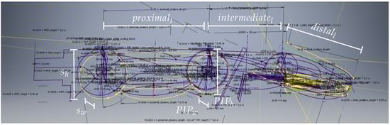 For the mechanical structure of the fingers we created a single scalable CAD-model of the finger. It is based on a skeleton that contains all sketches for all important features of the finger, as can be seen in Figure 2. Based on this skeleton, the three individual parts for knuckle, proximal and distal phalanx are derived by referencing the sketches in the skeleton model. The skeleton can be parametrised using seven high-level parameters that can be set individually and independently of each other. These parameters define the width and height of the proximal interphalangeal (PIP) joint ( and ) as well as the lengths of the proximal, intermediate and distal phalanx ( and ). Two additional parameters and represent scaling factors that are used to determine the width and height of the distal interphalangeal (DIP) and metacarpophalangeal (MCP) joints as follows: