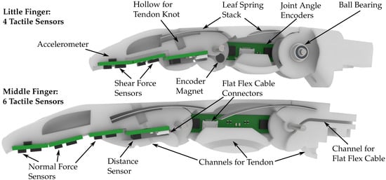 As shown in Figure 1 and Figure 3, a customizable number of sensors can be integrated into a finger, depending on the finger pad area available for the integration of tactile sensors. The middle, and thus largest, finger used in this work, shown in the bottom of Figure 3, contains a total number of ten sensors, which include two joint angle encoders, a distance sensor, three normal force sensors, three shear force sensors and one accelerometer. The sensor PCBs can be connected to a controller using FFCs via connectors on the joint angle encoder and distance sensor PCBs (see Figure 3), while the tactile sensor PCBs are connected through magnet wires.