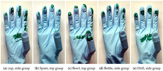 In order to find the optimal configuration and placement positions of the tactile sensors in each finger, we conducted tests to determine which surfaces of each finger are in contact when grasping different objects. These experiments were carried out prior to the definition of the tactile sensor layout and their results were used to define the area on the finger that should be covered with tactile sensors. We used the 50th percentile female version of the KIT Prosthetic Hand [], as well as five objects (banana, baseball, bowl, drill, spam) from the YCB object set [] and two objects (cola, green cup) from the KIT object set [], in order to have a variation of shapes and sizes. The outside surface of each object was painted green, after which the object was immediately grasped using either a top or a side grasp (approaching the object from the top or the side, respectively). From the experiments it is evident that the finger area that is in contact with most objects is the finger pad, especially that of the index finger. Examples of the experiment results can be seen in Figure 5. Thus, contact forces and slip can be measured most accurately by placing sensors in these areas.