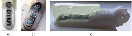 The entire area of the finger pad is then cast in an additional layer of silicone rubber (ShA 13), shown in Figure 7c. In order to ensure sufficient stability of the silicone layer, holes and canals with undercuts, as shown in Figure 6, are integrated into the finger tip. This design allows for increased adhesion of the silicone to the 3D printed material. Compared to the previous work, a larger part of the fingertip is cast in silicone rubber to enable a configuration with a larger number of sensors. This also contributes to an improved grasping behaviour as the silicone rubber is more elastic and has a higher friction coefficient compared to the 3D printed material [].