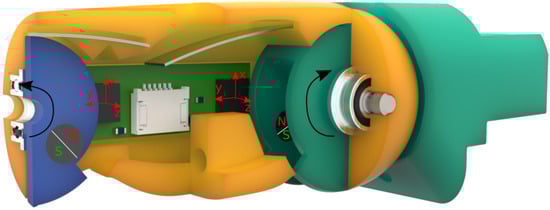 In this work, however, we perform this measurement off-axis both for the magnet and the sensor (MLX90393, Melexis), due to space constraints in the joints, which is shown in Figure 8. The magnets are glued into the distal/intermediate phalanx (blue) and the knuckle (green), and rotate around their respective joints when these are rotated. At 45 degrees rotation the magnets are positioned directly above the sensors, so that they have the same distance between each other at 0 and 90 degrees, which corresponds to the minimum and maximum angle, respectively, of all joints. The above stated Equation (1) can nevertheless be used to provide an approximation of the joint rotation angle using this off-axis measurement. However, when the placement of the magnet above the sensor changes in x or y direction, the magnetic field strength and therefore sensor output of the Hall effect sensor changes. Therefore, an experiment is necessary to determine the correlation between the sensor output and the actual rotation angle, which is described in Section 3.3.