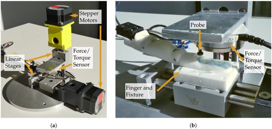 A series of experiments were conducted on the physical demonstrators to assess the performance of the sensors individually and as a coherent system. For the experiments regarding normal and shear forces, as well as a spatial mapping, a two-axis linear table was used as depicted in Figure 9. Each axis was a precision linear stage (PT4808, MM Engineering GmbH, Brackenheim, Germany) with displacement per turn attached to a stepper motor with 200 steps per turn. A force/torque sensor (Mini 40, ATI Industrial Automation, Apex, NC, USA) was mounted on one axis. The sensor could be equipped with a cylindrical probe with a diameter of , which was small enough to allow applying loads to individual sensors. A sensorised finger could be attached to the other axis, enabling the probe to apply normal forces to different parts of the finger along one axis, as well as shear forces when the finger was moved while normal forces were applied.