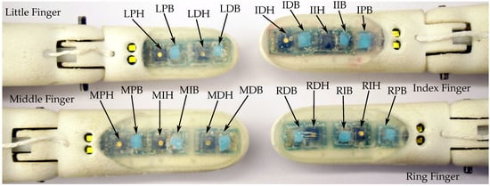 To be able to identify the individual tactile sensors for the experiments we adopted the following naming scheme: the sensor names started with the beginning letter of the finger they were included in—I for index finger, M for middle finger, R for ring finger, and L for little finger. The second letter denoted the position inside the finger—D for distal, I for intermediate and P for proximal. Note that the little finger did not have intermediate sensors. The third letter distinguishes the type of sensor—H for Hall effect-based sensors and B for barometer-based sensors. The Hall effect-based sensor at the tip of the index finger would hence be IDH. An overview over the positions of all tactile sensors and their corresponding designators in all physical demonstrators can be seen in Figure 10.