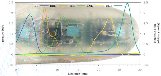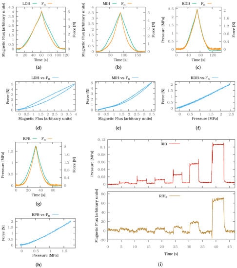 In terms of sensitivity the barometer-based sensors had a clear advantage over the Hall effect-based sensor as can be seen in Figure 11i. The barometer-based sensor RIB showed a discernible response even to the smallest weight of , whereas the noise in the signal of the Hall effect-based sensor RIH only allowed the detection of the fourth weight with sufficient confidence. The barometer-based sensors saturated by design at which was only slightly above the maximum sensor readings observed during the above experiments at 2 . The Hall effect-based sensors on the other hand showed a clear signal at forces up to 5 .
