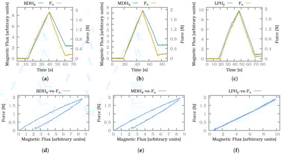 Exemplary shear force measurements for sensor signals RDHx (a), MDHx (b) and LPHy (c) as well as the corresponding hysteresis plots (d–f).