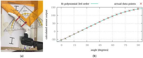 As mentioned, due to space constraints the measurement of the joint rotation angles is performed off-axis in this work (see Section 2.4). Therefore, an experiment, shown in Figure 13a for the MCP joint of the index finger, was necessary to determine the correlation between the calculated sensor output (using Equation (1), based on the magnetic field strengths and in x and y direction) and the actual rotation angle of the joint. To determine this correlation, we moved each joint of each finger incrementally in steps of 5 , starting at 0 and ending at 90 , which corresponds to the minimum and maximum rotation angle of each joint, respectively. To ensure that only the correct joint was rotated, we fixed the other joint during the measurements. At each step the sensor output () and rotation angle were recorded, after which the joint was bent five degrees further. The resulting correlation between rotation angle and sensor output was then used to obtain a 3rd order polynomial fit for each joint, shown for the MCP joint of the index finger in Figure 13b. This fit can be used for the real time control of the finger to directly calculate the rotation angle of each joint during the data processing step.