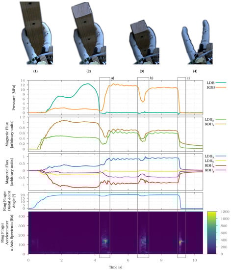 After around 5 seconds the first slip event occurs, marked by box a). Just prior to the event, grip strength is reduced as indicated by all sensors LDB, LDHz and RDHz. The reduction of grip strength also results in a slight reduction of the joint angle in the distal joint of the ring finger (fourth plot). The gross slip is detected by the accelerometer y-axis, as can be seen in the STFT of the signal at box a) (fifth plot). As soon as the slip occurs, the grip is manually strengthened again. During the slip event the contact point of the block on the fingers changes, as can be seen when comparing Figure 14(1) and Figure 14(2). On the ring finger it moves between the sensors RDB and RDH, whereas on the little finger it moves away from LDB towards LDH. Hence the normal force sensor RDB gets loaded while RDHz gets partly released. The opposite is true for the little finger. The slip event also induces a small pendulum motion on the wooden block around the two contact points which can be seen in the small waves in all loaded sensors after the first slip event.