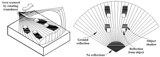 The acoustic images were gained using Seaking DST Sonar, a type of FLS which is manufactured by Tritech []. The sonar is characterized by a fan-shaped beam that is rotated mechanically to create a spatial map of its surrounding area, and it produces a single ping at each angle and waits for the return before stepping to the following angle, continuing until the entire sector is scanned. Returns from each ping are then used to create the image, as is shown in Figure 1. It is the type of sonar most commonly used for collision avoidance, but also finds applications in mine detection and surveillance. Specifications of the sonar are shown in Table 1.
