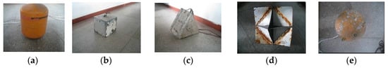 Selected experiment targets: (a) first target, pontoon; (b) second target, cube; (c) third target, triangular prism; (d) fourth target, reflector; and (e) fifth target, sphere.