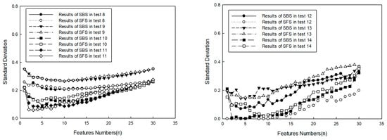 Figure 6 shows that, if statistic rules could not be founded by SFS and SBS in each test, then the average values of standard deviation were counted, which are shown in Figure 7. For the classification method, it was shown that average values gained by SFS were smaller than those gained by SBS if the number of selected features was less than 12. For selected features, it was shown that average values declined with the increase of selected features if the number of selected features was less than 5. This indicated some useful description information drawn into the classification by new added features of the target, so the accuracy of target classification was improved. In contrast, as the number of selected features was more than 5, errors increased with the increase of selected features. This indicated some useless description information draw into the classification by new added features, which had more of an effect on target classification, so error rate was raised. From the results, it can be seen that it was not beneficial for target classification to select more features. According to the results, it may have been the best choice to select five types of features, and for SFS to obtain the smaller classification error rate.