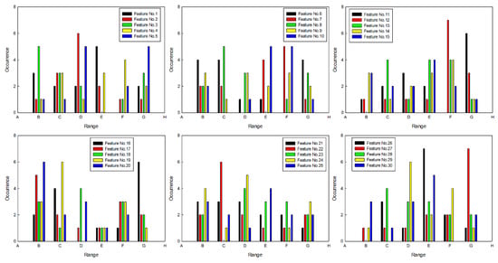 On the basis of the above conclusions, the sets of features were selected by SFS, and the statistical results of feature order are shown in Figure 8. As only five types of features were used to set up the feature set, the feature order was divided into six intervals (shown in Table 6), and statistical results were rearranged, which are shown in Figure 9. Then, five types of features that had more occurrences were selected in interval B, and they are shown in Table 7.