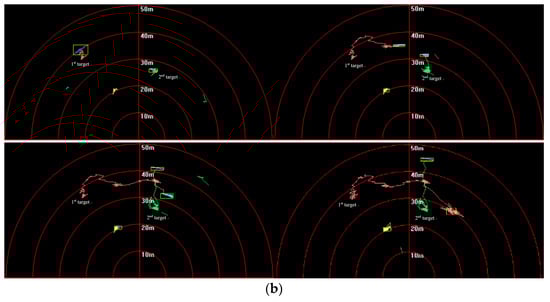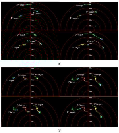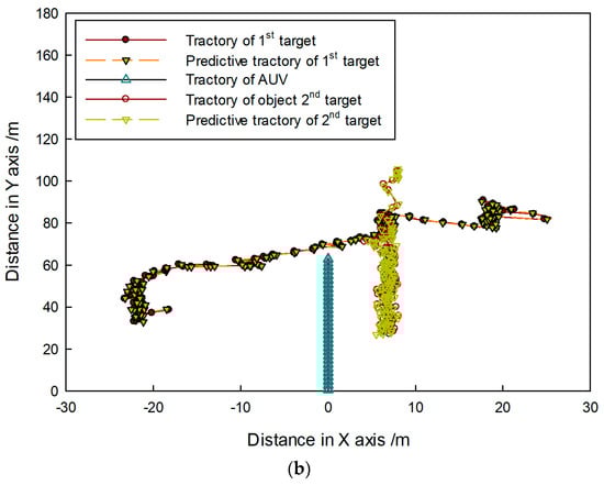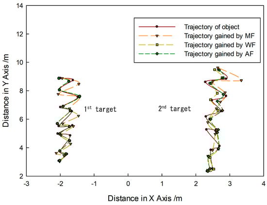 In the sea trial, it was hard to make more than two targets move under the existence of a crossing path. Therefore, tracking problems of two kinds of targets are still considered of which trajectories intersect. Results are shown in Figure 25, Figure 26 and Figure 27.
