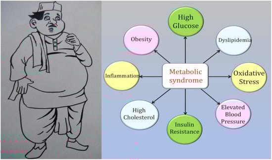 Advances in the health sector have greatly improved the health and life span of people. However, modern technological advancements have also resulted in dramatic changes in the way of life of individuals from both the calorie intake and energy consumption perspectives. A gross imbalance between the calories consumed and energy spent has resulted in the emergence of a new set of metabolic and age-related disorders that makes an individual more susceptible to chronic diseases, which if not detected in the early stages can turn fatal []. Metabolic syndrome (MetS) is a condition that refers to a cluster of risk factors that arises due to several dysfunctional biochemical pathways, thereby predisposing an individual to various non-communicable diseases []. MetS has emerged as a major health concern worldwide in the recent decades and is possibly connected with the life-style changes in the modern era []. Several risk factors have been identified to be part of the constellation of abnormalities leading to MetS (Figure 1). These include elevated blood glucose, triglycerides, cholesterol levels, obesity, oxidative stress and blood pressure [,,,,].