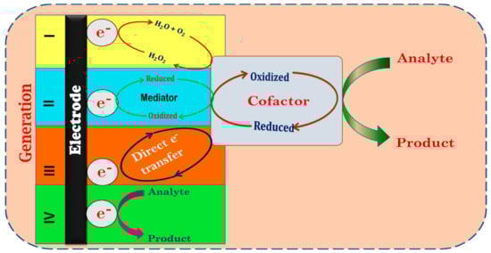Electrochemical biosensors have been developed over the years in terms of their superior sensitivity, quick response time as well as the wide range of analyte molecules that can be detected easily using the surface modification process according to the analyte of interest. Figure 2 depicts the schematic representation of the different generations of electrochemical sensors developed over the years. The earliest electrochemical sensors known as the first-generation sensors quantified the analyte indirectly by measuring the accompanying changes in the hydrogen peroxide or oxygen concentrations. However, this strategy restricted the type of analytes that could be detected as well as that had lower sensitivity. As the redox site in most enzymes is buried deep in the interior, accessibility restrictions and slow electron transfer from the analyte are common in these types of sensors resulting in slow response time [,]. These limitations were overcome in the second-generation sensors that employed a redox mediator such as ferrocene or quinone to shuttle electrons from the bio-recognition element to the electrode surface. This strategy eliminates indirect measurement of the analyte and enables faster detection. However, use of a redox mediator for electron transfer makes these types of sensors prone to interference from other electro-active species in the sample. Furthermore, choice of an appropriate redox mediator is an added complexity in the sensing process []. Hence, the third-generation sensors employed a direct transfer of the electrons from the biorecognition element to the working electrode surface. To ensure rapid response and sensitivity in this type of sensors, intimate contact of the biorecognition site with the electrode surface is required. The immobilization of the biosensing element on the working electrode surface, therefore, acquires prime importance for efficient electron transfer. Both physical and chemical methods of immobilization have been reported. The interactions between the immobilized biomolecule and the electrode surface are generally hydrogen bonding, electrostatic, hydrophobic and dipole–dipole interactions. However, the third-generation sensors are limited by accessibility issues, diffusional limitations and denaturation risks of the biological sensing element []. Hence recent times have seen the emergence of a fourth generation of sensors which employ chemical entities that serve as bio mimics to overcome the stability issues associated with the immobilization of biological molecules on the electrode surface [].