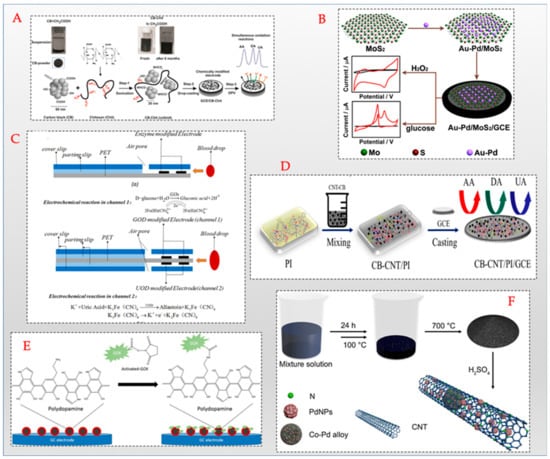 Schematic representation of different modification processes of working electrodes utilizing different nanomaterials (A) carbon black [] Copyright © 2017 Elsevier, (B) molybdenum disulphide (MoS2) nanosheets [] Copyright © 2017 Elsevier, (C) enzyme modified screen printed electrodes [] Copyright © 2017 Elsevier, (D) carbon black–carbon nanotubes [], (E) magnetite nanoparticles/polydopamine [] Copyright © 2017 Elsevier, (F) Palladium-cobalt nanoparticles/ carbon nanotubes [] Copyright © 2017 Elsevier.