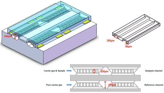 The μTCD in this paper consists of four resistors with the same resistance, and the four thermistors form a Wheatstone bridge. If only pure carrier gas is transported into the channels at the same time, the bridge is balanced because the resistance values of these thermistors are the same. When carrier gas with sample flows through the analysis channel and pure carrier gas flows through the reference channel, the balance of the bridge will be broken and an output voltage will be obtained [11]. In order to obtain higher sensitivity, four resistors supported by a beam were suspended in the center of the airflow channel (as shown in Figure 1), which was released by deep reactive ion etching (DRIE) [12] and KOH etching [8,13].
