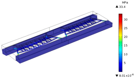 Thermistors supported by cantilever beams were suspended in the thermal conductivity cell, which was able to reduce the heat loss of the substrate, thus improving the detection sensitivity. However, the cantilever beam will vibrate under the impact of the carrier airflow, resulting in stress and deformation, thus causing greater thermal noise. Thermal noise is an important factor affecting the sensitivity of the sensor, which will reduce the sensitivity and stability of the sensor. In order to reduce the thermal noise, the thickness of the cantilever beam is simulated. Figure 4 shows the relationship between the stress on the cantilever beam and the film thickness under certain loading conditions (constant flow rate and loading power). The results (as shown in Table 1) show that the stress decreases greatly with the increase of the thickness of the cantilever beam. Therefore, a layer of low-stress silicon nitride film in which the maximum thickness can be processed is selected as the supporting beam, improving the consistency and reliability of the detector.