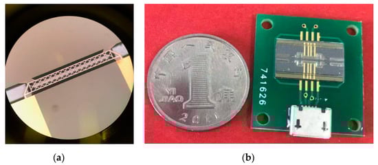 (D) The supporting beam was released by DRIE and potassium hydroxide etching to obtain a gas flow channel and finally bonded to the pyrex 7740 glass to obtain μTCD. Figure 7 indicates the micrograph of the μTCD and the photo of the sensor.