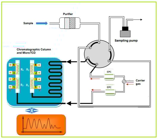 In this work, a portable gas chromatography system integrated with a GC column and μTCD was proposed for monitoring small molecular gas. The proposed system (refer to Figure 8) was mainly composed of sample pretreatment, carrier gas, pneumatic control system, chromatographic column, μTCD, signal acquisition, and a processing module. To obtain high sensitivity and working life, a constant current of 75 mA was applied to the sensor. H2 was used as carrier gas due to its high thermal conductivity, and the flow rate of the carrier gas was precisely controlled by the EPC valve. The injection volume was controlled by a 0.2 mL quantitative ring. The dissolved gas was quickly separated by chromatographic column and then transported into the detector by carrier gas, so as to realize accurate quantitative detection of each component.