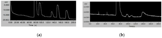 In this work, in order to evaluate that the developed system has the ability to detect trace samples, two standard samples were used for experiments. In the experiment, the samples were dissolved into the naphthenic transformer oil and then extracted and detected. Firstly, a sample containing four kinds of dissolved gases was used to perform the separation and detection performance of the system, where the concentrations of CH4, C2H2, C2H4, and CO were 109.2 ppm, 95.7 ppm, 115.6 ppm, and 106.1 ppm, respectively. The experiment was performed under isothermal conditions at 80 °C with carrier gas velocity of 5 mL/min. Figure 9a shows the chromatogram of the four dissolved gases, which show that these trace components are highly responsive and effectively detected.